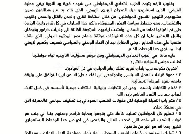 بيان مهم : الحزب الاتحادي الديمقراطي يترحم علي شهداء قرية ود النورة و يدين انتهاكات المليشيا ومواقف المجتمع الدولي