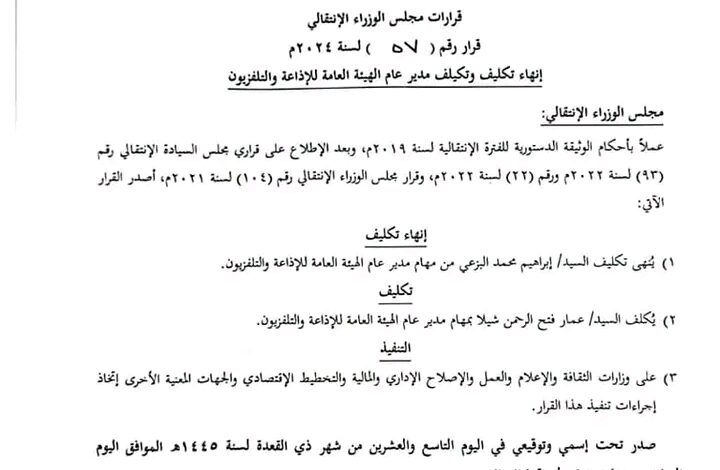 أصدر وزير شؤون مجلس الوزراء المكلف بتسيير شؤون مجلس الوزراء عثمان حسين عثمان اليوم قرارا بإنهاء تكليف إبراهيم محمد إبراهيم البزعي من مهام مدير عام الهيئة العامة للإذاعة والتلفزيون ، وتكليف عمار فتح الرحمن شيلا بمهام مدير عام الهيئة العامة للإذاعة والتلفزيون .
