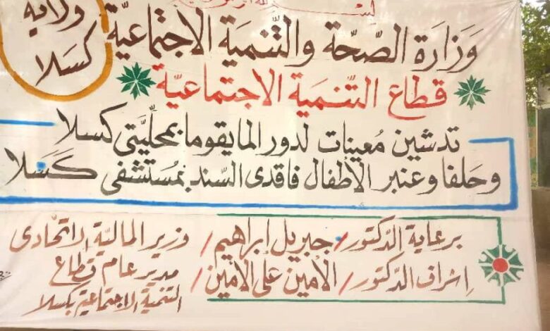 دشنت وزارة الصحة والتنمية الاجتماعية قطاع التنمية الاجتماعية انابة عن حكومة كسلا المرحلة الأولى من برنامج المعينات لتأهيل وتأسيس دور إيواء الأطفال فاقدي الرعاية الوالدية ( أطفال المايقوما ) إضافة الى عنبر أطفال كسلا بتكلفة بلغت الستين مليون جنيها بتمويل من وزارة المالية الاتحادية.