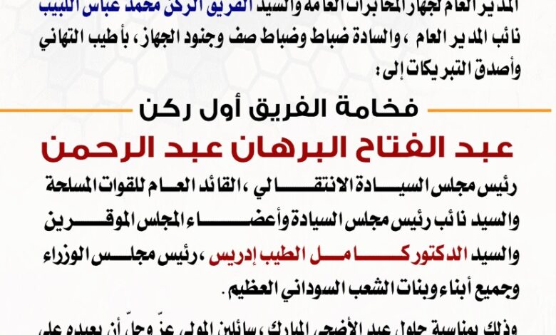 جهاز المخابرات العامة يهنئ القيادة والشعب السوداني بعيد الأضحى المبارك
