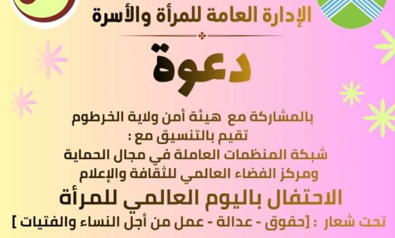 ويقام الاحتفال تحت شعار (حقوق – عدالة – عمل من أجل النساء والفتيات)، برعاية مدير عام وزارة التنمية الاجتماعية والوزير المكلف الأستاذ صديق حسن فريني، وتشريف والي ولاية الخرطوم أحمد عثمان حمزة